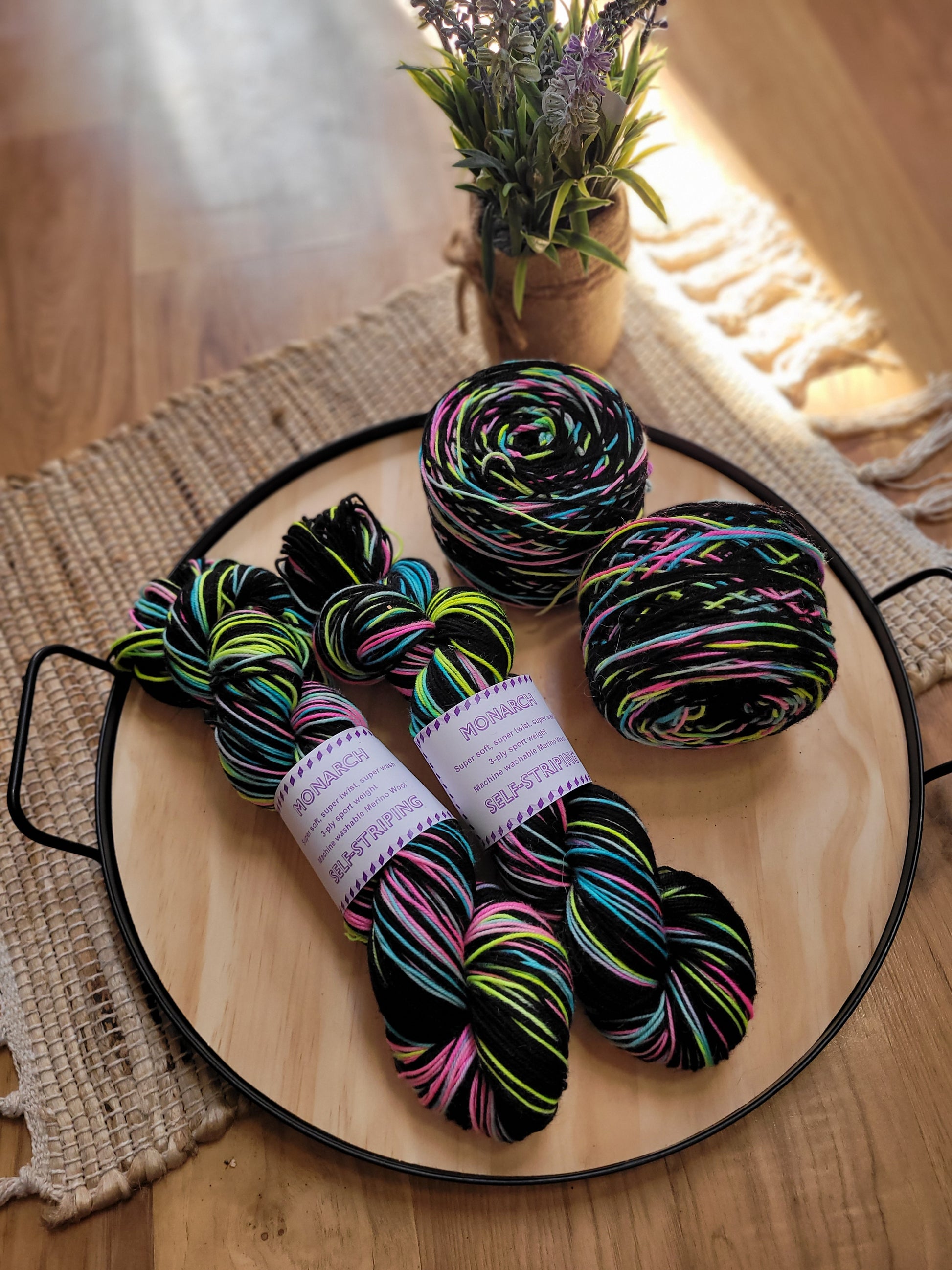 Fly*Dyed Monarch yarn is super soft, super twist, super wash merino wool. As shown in the example photograph, this yarn is self-striping when it is knit into a pair of socks! Comes in a skein.