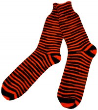 Fly*Dyed Monarch yarn is super soft, super twist, super wash merino wool. As shown in the example photograph, this yarn is self-striping when it is knit into a pair of socks! Comes in a skein.
