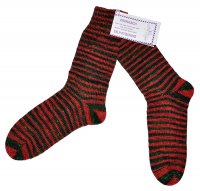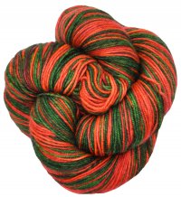 Fly*Dyed Monarch yarn is super soft, super twist, super wash merino wool. As shown in the example photograph, this yarn is self-striping when it is knit into a pair of socks! Comes in a skein.
